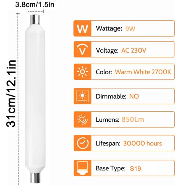 S19 Linolite LED Tubular Strip light Bulbs Size 310*38MM Hrs:15000H 230V 9W 900LM CRI>80 DF>0.7 SDCM<6 PST<1.00 SVM<0.4