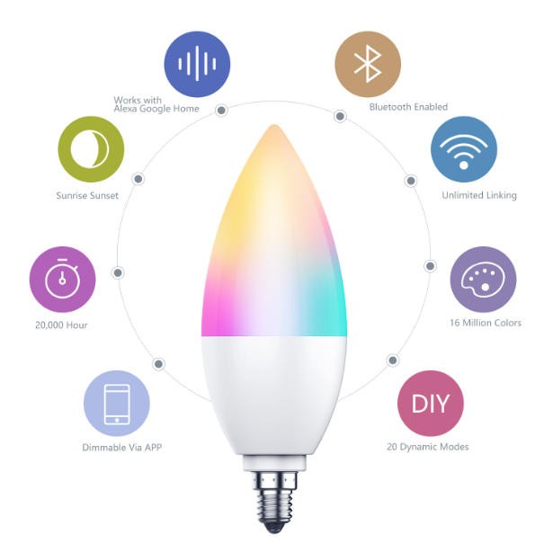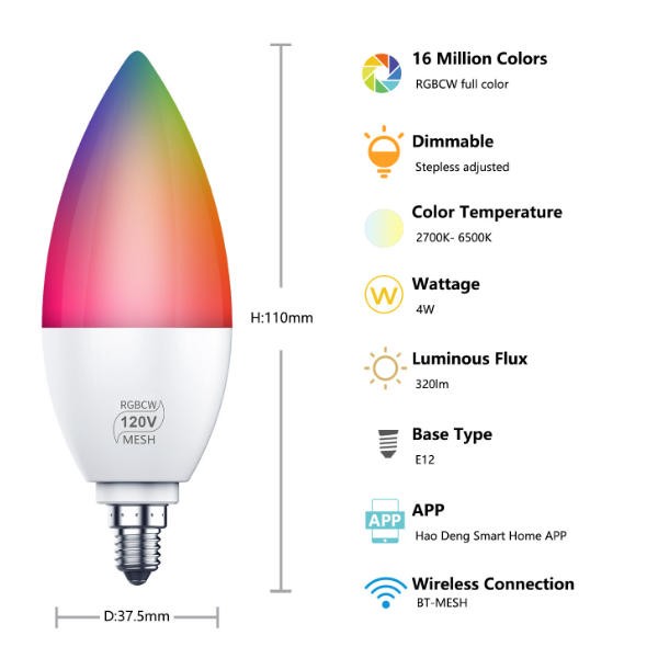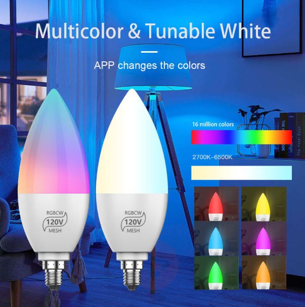 E12 Smart Bulb LED Candle lamp Match tuya, alexa and google assistant E12 candelabra Base with 110V / 220V Energy Efficient LED technology Competitive price + Factory direct OEM & ODM, Wholesale Low wattage, comfortable, flicker-free light. CE FCC ROHS ERP PSE certificated Mainly used in household, living room, ceiling, home, shopping mall, commercial lighting, hotel lighting, etc.
